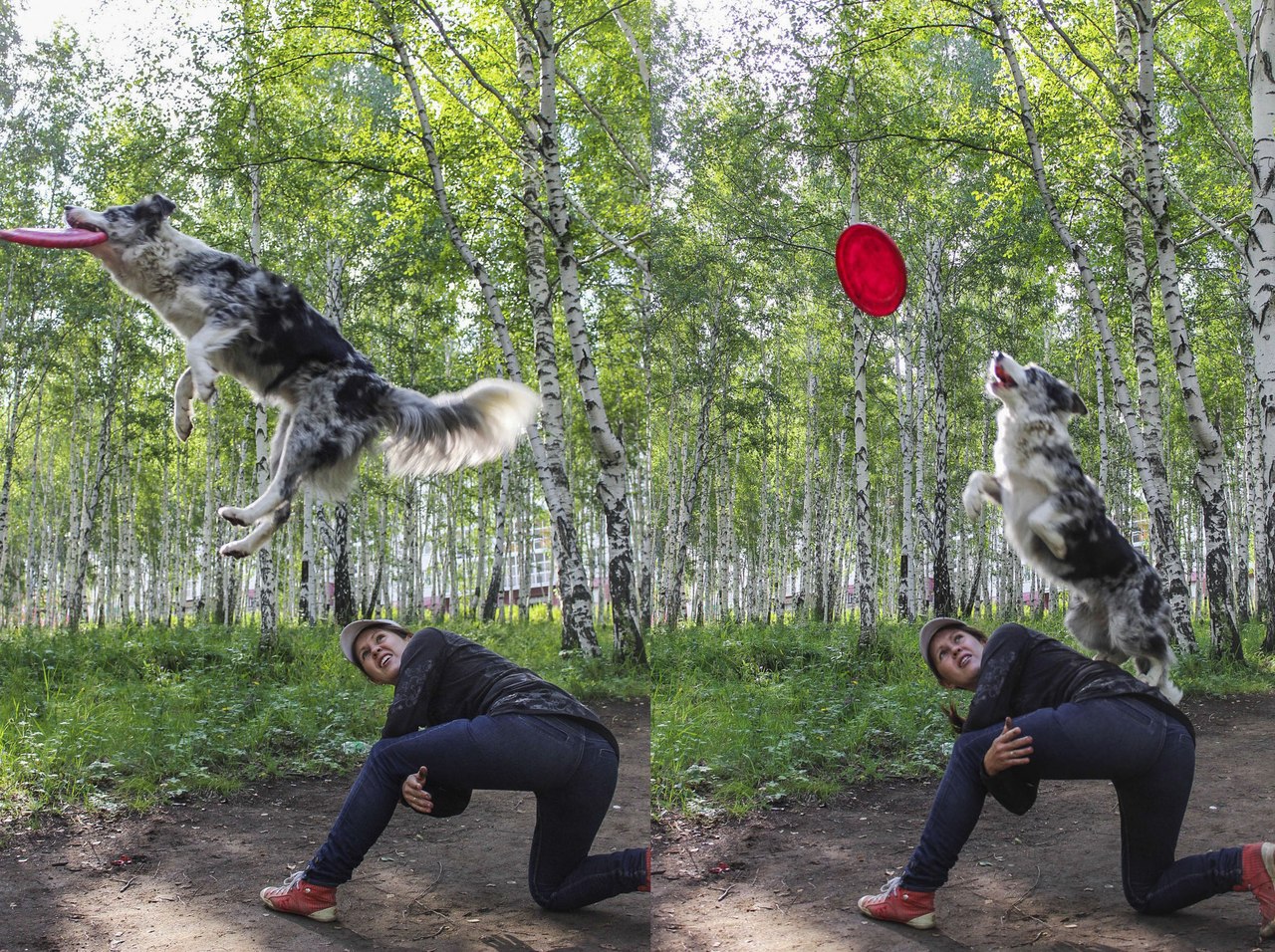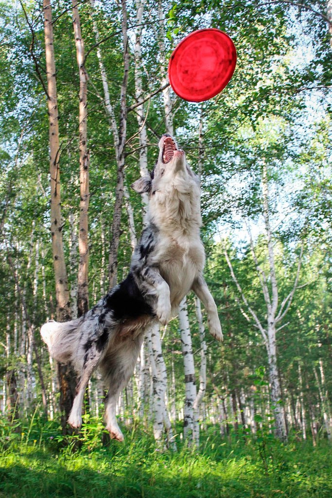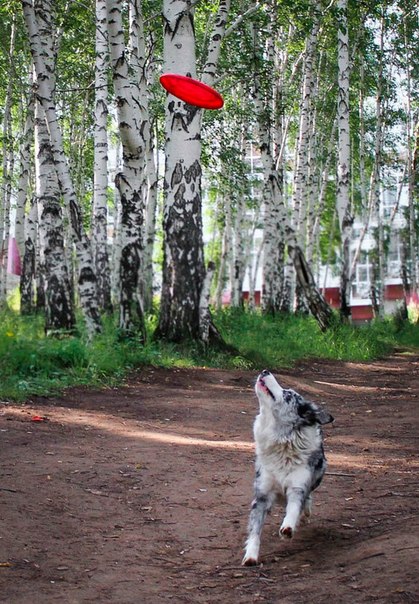 У меня собака просто маньячит дисками, может часами бегать за ними. Начинали со щенков, бегали за роллами, потом научились ловить диски в полете, сейчас потихоньку учим элементы фризби-фристайла. Не очень пока получается, одной не удобно, в некоторых элементах нужна помощь, но кое-что уже получается более менее.) К сожалению фоток почти нет, некому нас фотать=)