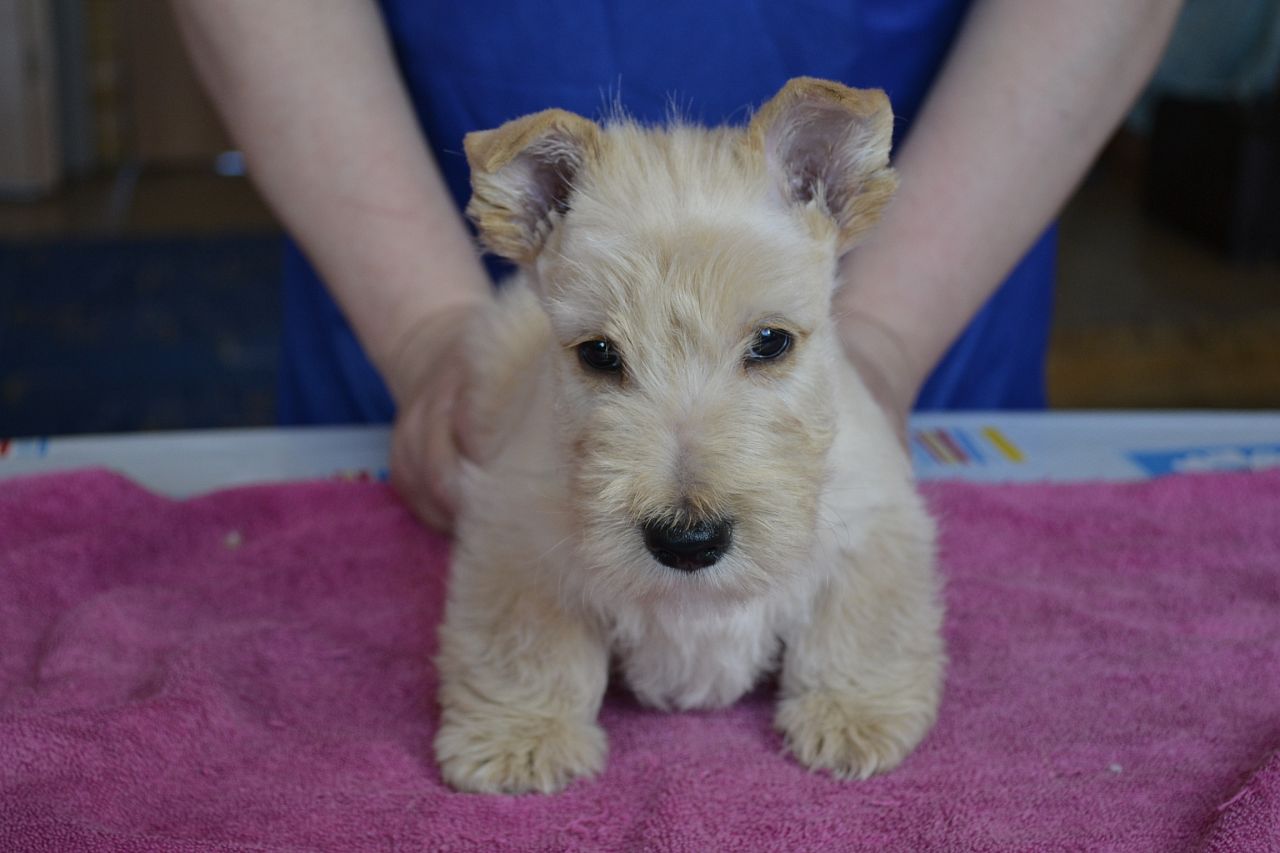 Племенной питомник "из Черной Дружины" предлагает щенков скотч терьера рожд. 27.01.14. Три суки(2-пшеничного окраса, 1-тигрового окраса) и кобель тигрового окраса. Родословная, клеймо. щенки кс хорошим костяком, широкие, глубокие.