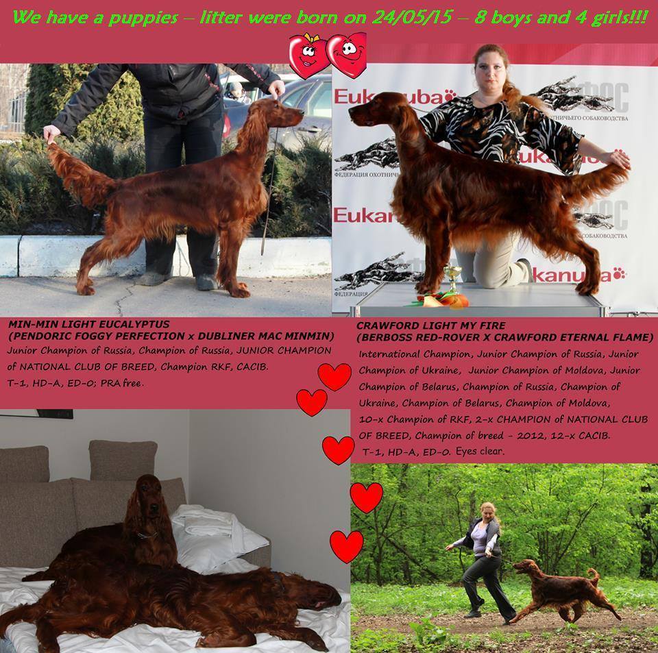 Мать - MIN-MIN LIGHT EUCALYPTUS (импорт Швеция) - Юный Чемпион России, Чемпион России, Юный Чемпион Национального клуба породы "Ирландский сеттер", Чемпион РКФ, САСИБ, Т-1 (Тестирование психики собак для допуска в разведение), HD-A, ED-0 (официальный тест на отсутствие дисплазии), Глаза проверены (генетический тест).