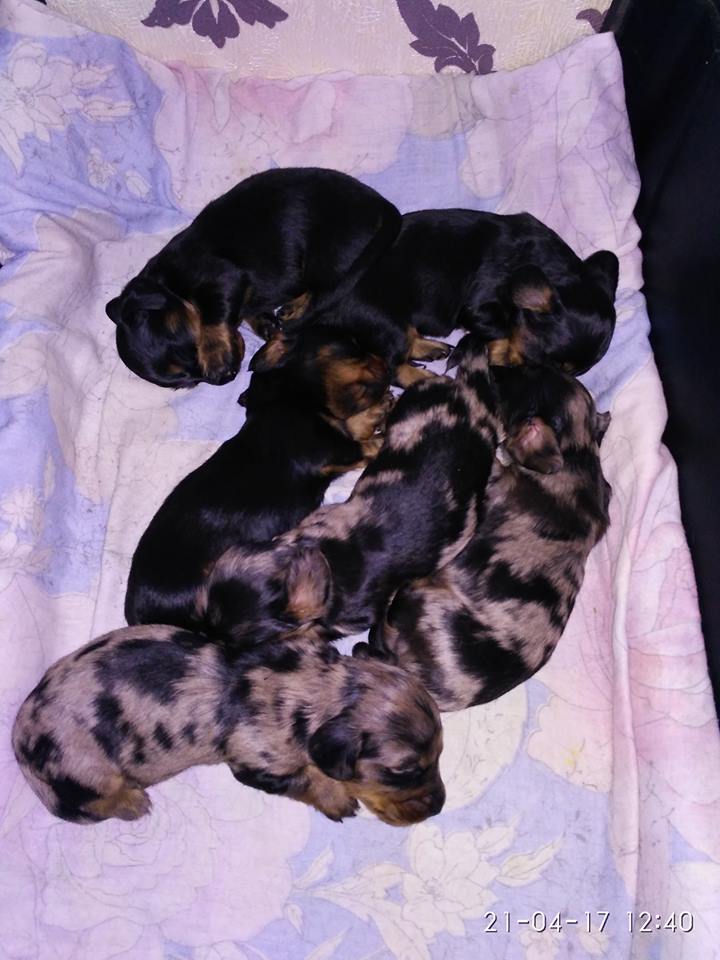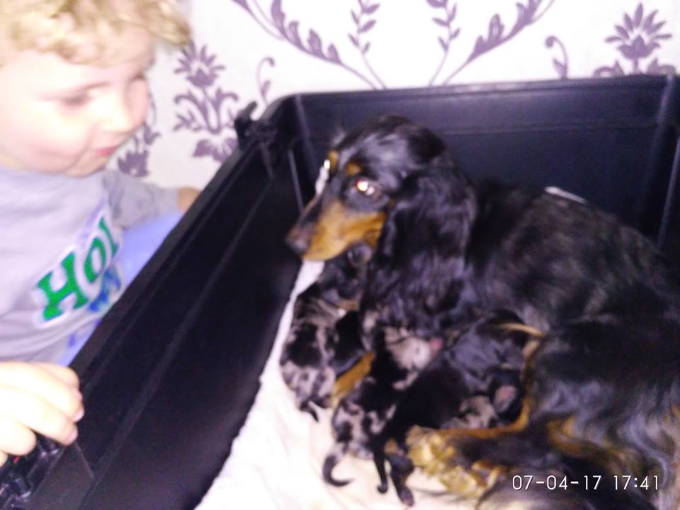06.04.2017 появились на свет три мальчика и три девочки миниатюрной длинношерстной таксы чёрно-подпалого и чёрно-мраморного окраса от родителей-чемпионов (Шварцен Вальд Харди Хантер и Miracle of Love Little Dranatanja).
