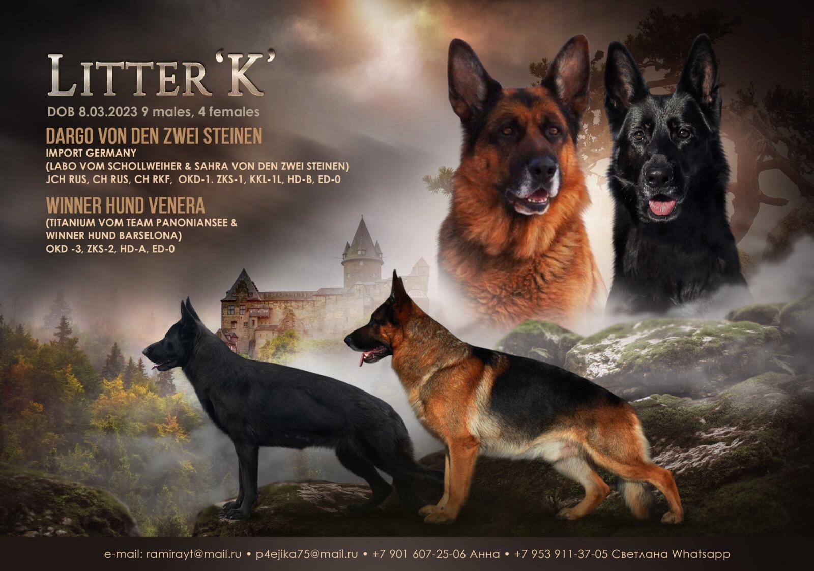 о . Dargo von den zwei Steinen, импортирован из Германии, сын знаменитого отборника Германии Labo vom Schollweiher , ОКД-1, ЗКС-1, ED-0, HD-B, Kkl-1П.Юный Чемпион России, Чемпион Росси, Чемпион ОАНКОО, Чемпион РФСС, Чемпион РФЛС, Чемпион РКФ, 3хЛПП, RCACIB.