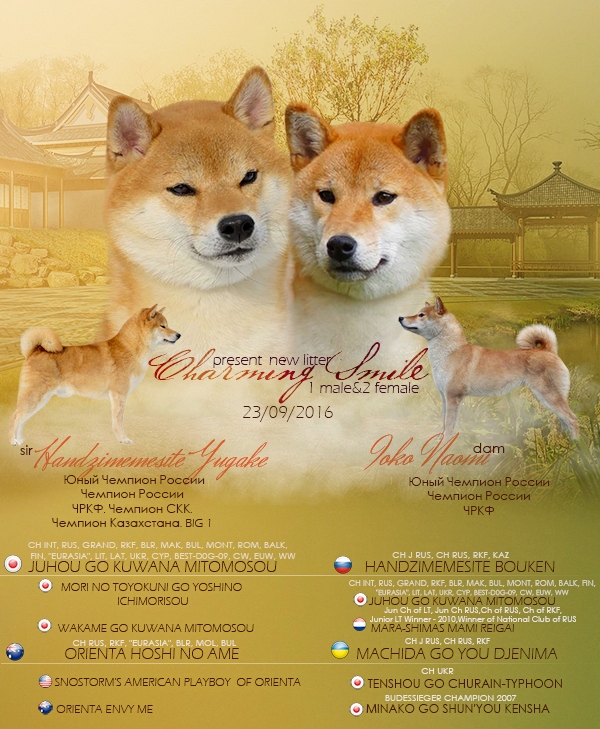"CHARMING SMILE" предлагает на продажу девочку породы Сиба Ину ярко рыжего окраса д/р 23 сентября от титулованной пары неоднократно проверенной по потомству.