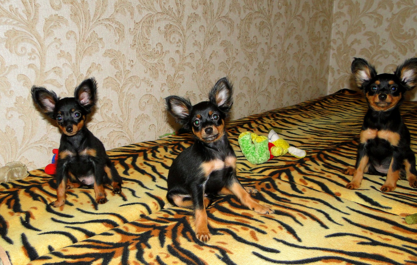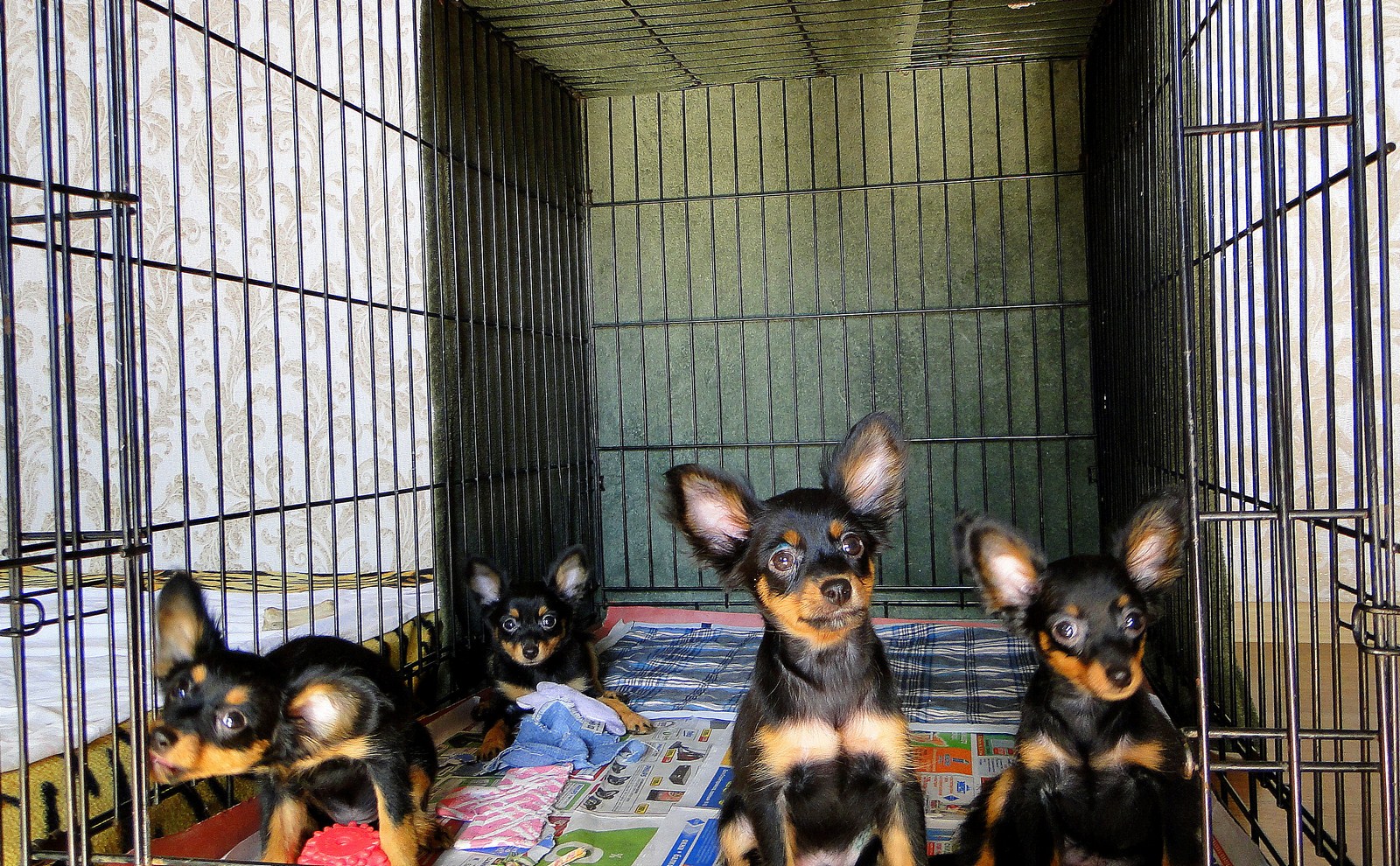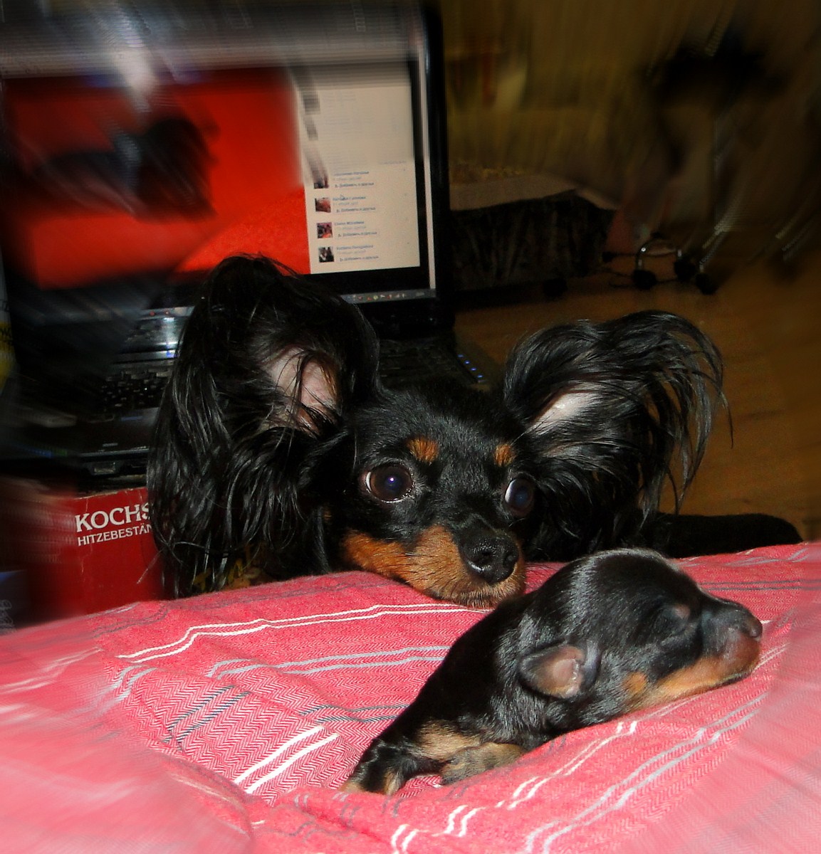 Генри заигрывает с дядей Йосиком (с нами живет гладкошерстный той терьер), ему со взрослыми то играть интересней, так как тот в свою очередь тоже на него замахивается лапами. А мама Шери, накормив банду, лежит и издалека наблюдает за всем этим и уже не оберегает детей от всех, как маленьких.