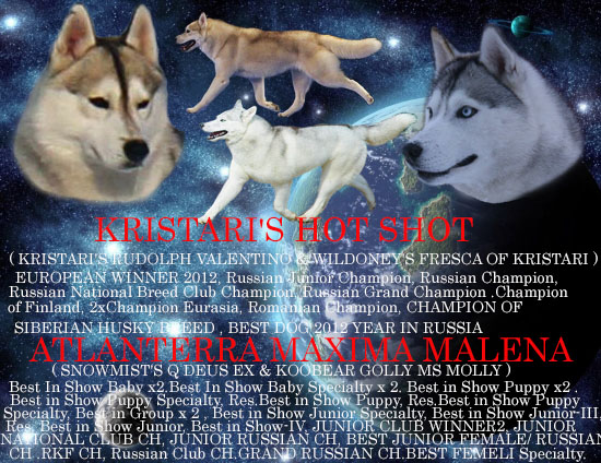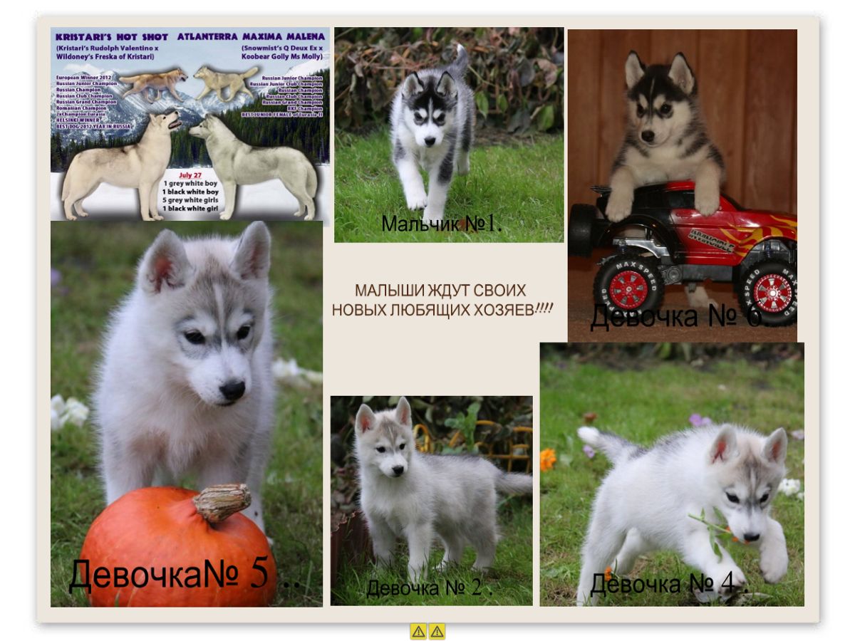 Питомник MIKHMAKOEN к продаже предлагаются щенки рождённый 27 июля 2015 года .4 девочек 3 серо- белых и 1 чёрно-белая. И 1 мальчик, чёрно- белый .От титулованной пары .Родители : KRISTARI'S HOT SHOT & ATLANTERRA MAXIMA MALENA .Помёт несёт в себе крови Лучших Питомников Мира . Этот помёт очень особенный для нас,в нём мы видим лучшие качества породы "Сибирский хаски " .Щенки для шоу карьеры и племенного разведения .У обоих родителей проверены глаза и суставы .Щенки будут иметь документы РКФ .Прививки по возрасту .Чип ,клеймо и пожизненную консультацию заводчика. Папа щенков в 2012 году стал Лучшей собакой России . Мама щенков стала Лучшей сукой на ЕВРАЗИИ - 2 В 2014 году .В большой конкуренции . Телефон 89231870511 . 89237065311.