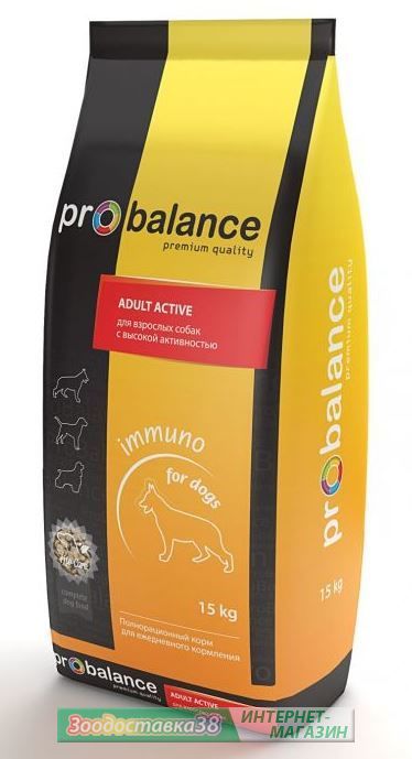 ProBalance® Immuno ADULT ACTIVE для взрослых собак с высокой активностью предназначен для ежедневного кормления взрослых собак всех пород с высокой активностью. Высокая калорийность корма обеспечивает собаку запасом энергии на целый день, а повышенное количество белка способствует развитию мускулатуры.