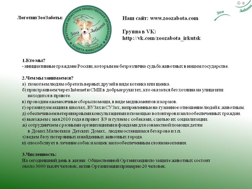 Данная организация является Иркутской Общественной Благотворительной Организацией "ЗооЗабота", которой не безразлична жизнь животных Иркутска и отношение к ним людей. Мы создали свою организацию для того, чтобы помогать тем животным, которые находятся в трудной ситуации.