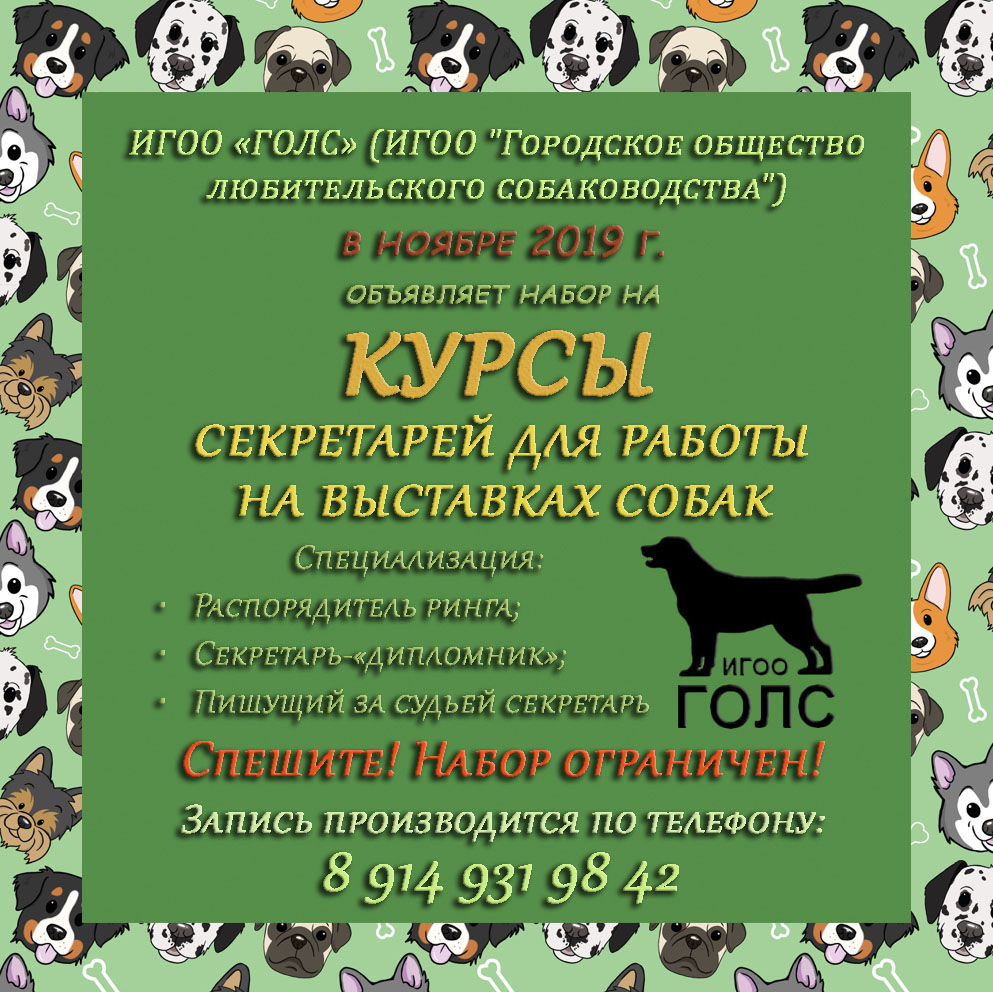 ИГОО «ГОЛС» (Иркутская Городская Общественная Организация "Городское общество любительского собаководства") в ноябре 2019 г. объявляет набор на курсы секретарей для работы на выставках собак. Специализация: • Пишущий за судьей секретарь; • Секретарь-«дипломник»; • Распорядитель ринга. Спешите! Набор ограничен! Запись производится по телефону: 8 914 931 98 42.