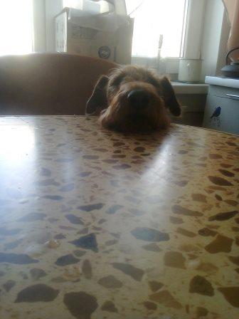 :D А у нас картина под названием: "А вот сейчас главное не шевелиться". Мордой на стол ей, естественно, нельзя.
