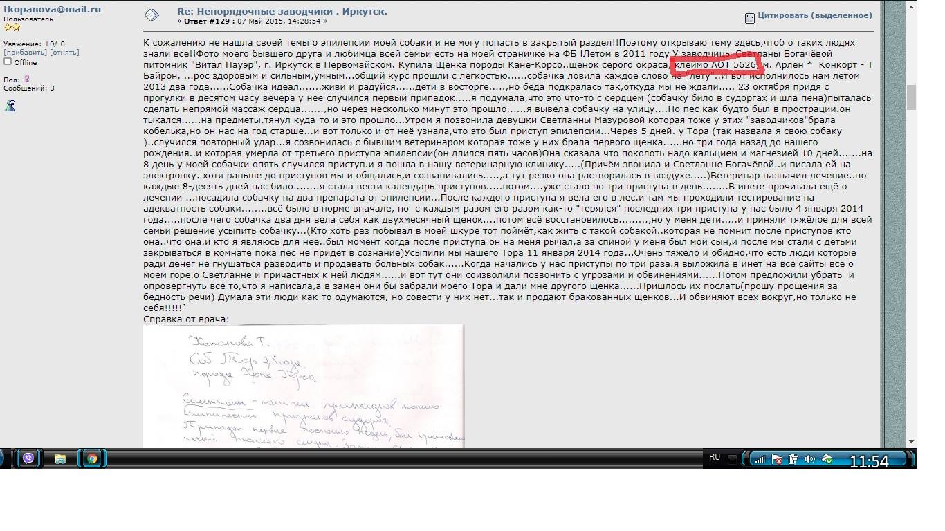 Тему «эпилепсии» она БЕЗДОКАЗАТЕЛЬНО распространяет давно в виде сфабрикованного письма Год назад в ходе СУДЕБНЫХ РАЗБИРАТЕЛЬСТВ с ней (она выступала в суде в качестве ответчика) было вывлено, что клеймо, прописанное в письме,не принадлежит кане-корсо! (выписку с печатью клуба из плем книги прилагаю) ЧТО ДОКАЗЫВАЕТ СФАБРИКОВАННОСТЬ рассылаемого письма и КЛЕВЕТНИЧЕСКИЙ характер информации.