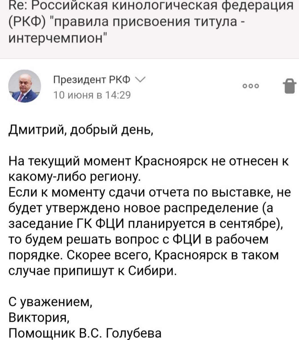 Здравствуйте. Скажите пожалуйста, откуда информация, что Красноярск это отдельный регион для титула интерчемпион. Я писал письмо в РКФ с просьбой разъяснить отдельный регион Красноярск или нет. Вот ответ.