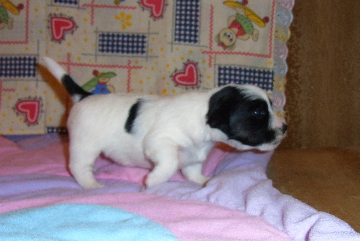 Девочка №1, моя любимица. Окрас бело - рыжий.Очень смелый ребенок, самая первая стала выползать из гнезда, пытаясь изучить просторы для дальнейших проказ.