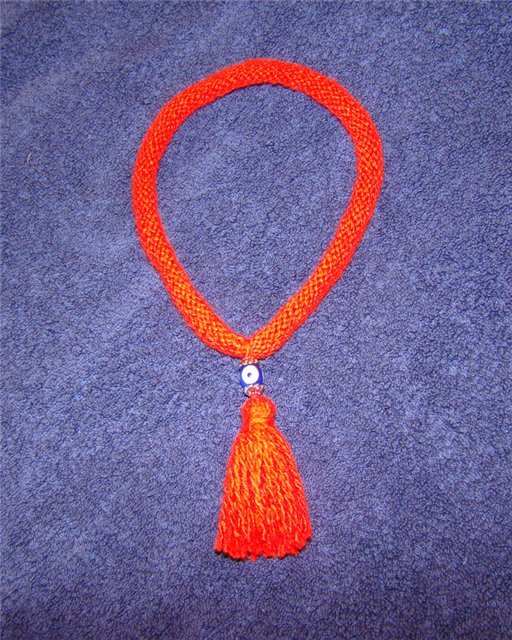На спицах вяжу чулочной вязкой - ряд лицевых, ряд изнаночных. Где-то рядов восемь-десять, в зависимости от желаемой толщины. Эта вязка сама автоматически скручивается в колбаску. Оставляю "хвосты" нитей сантиметров по двадцать. Сшиваю этими хвостами края связанной полоски встык, связываю два хвоста, продеваю в красивую бусину желательно с "глазиком" и ими же закрепляю кисть. Получается вот так: