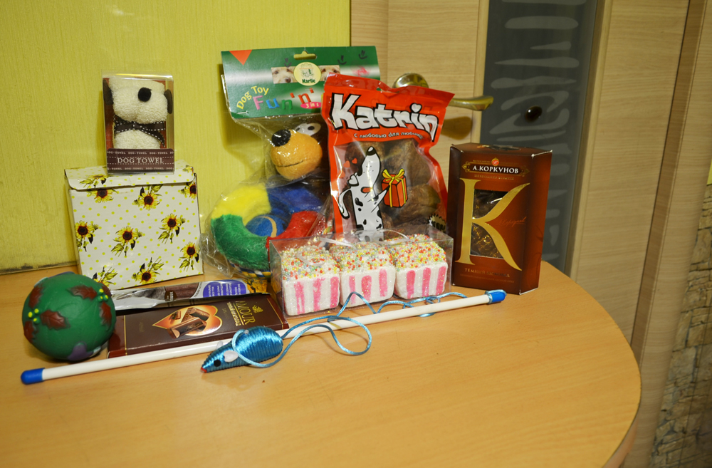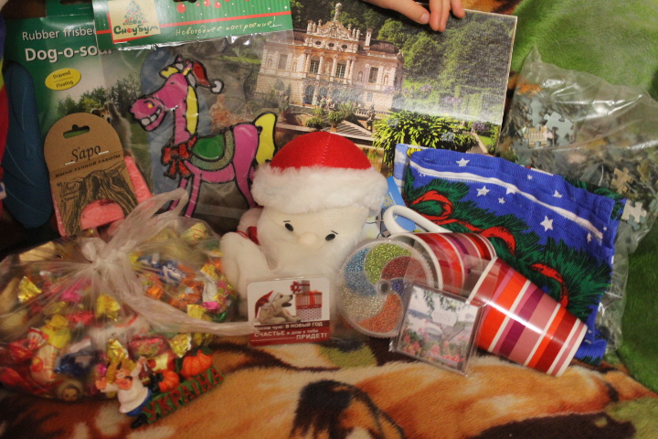 Содержимое: Солонка-соусница, вкусняшки для собак, колбаски для кошки, игрушки для собак и мышка доля кошки, полотенце в виде бигля, вкусняшки для меня - конфетки и шоколадка и ёлочные игрушки в виде кексиков
