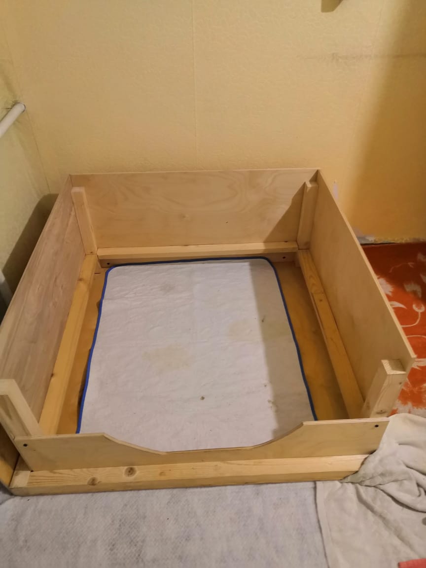 больше не нужен. Пользователем был скотч терьер. Подошло идеально. Размеры 85 на 85 см. Высота 40 см основная, передняя стенка низкая (т.к. было рассчитано на коротколапую собаку, но к ящику еще прилагаются 2 куска фанеры поставить впереди при необходимости). Внутри брусок, прикреплён на высоте 10 см от дня ящика. 4000