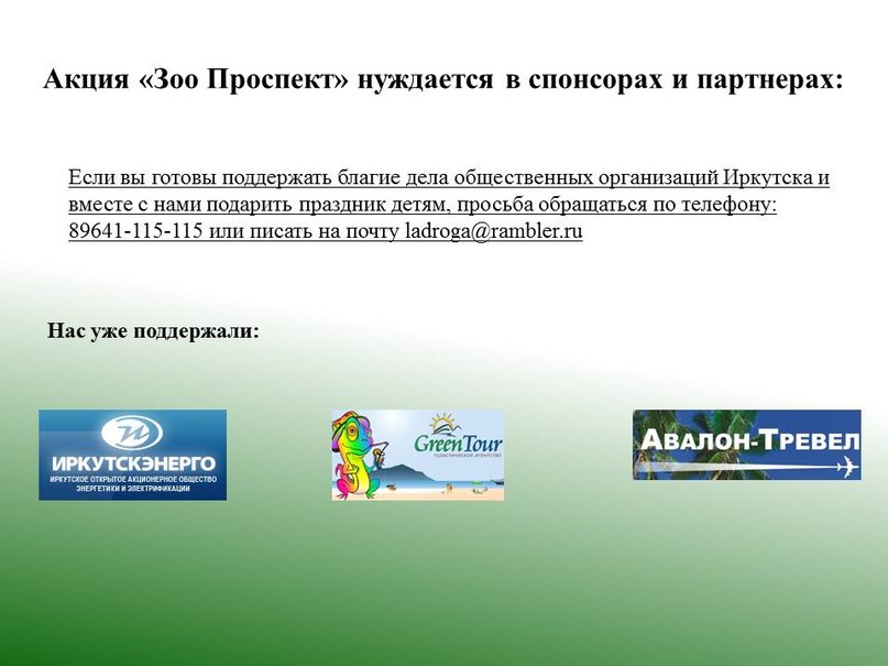 Наш адрес Байкальская, 236; контактный телефон 958883 – Софья.