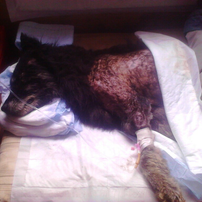 Друзья...Ребята..и снова мы просим о помощи,Вас, неравнодушных(((.Собу, с торчащим из нее щенком кое-как нашли. В ужасном состоянии достали из под дома. Страшное.обезвоживание и интоксикация.Разложившийся трупик щенка вынули из нее.Оперировать надо, но крайне опасно-не переживет наркоза. Назначили интенсивную терапию на пять дней. Потом контрольное УЗИ и операция по экстирпации матки и придатков . финансово сами не осилим. Если у кого-то есть возможность помочь,-будем Вам очень-очень благодарны. Сейчас ставим метрогил, синулокс, физ. раствор с глюкозой и витамом. Нужны памперсы самые большие, пеленки... Девчонка совсем юная(((года нет еще..