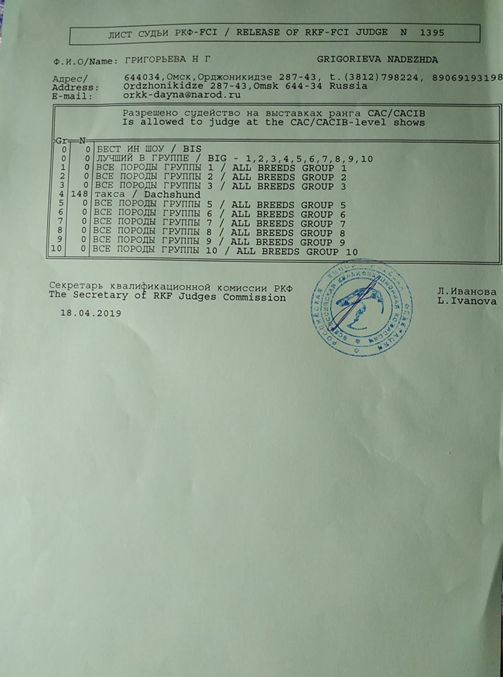 Экспертизу будет проводить судья по всем породам собак Григорьева Надежда Геннадьевна (г. Омск).