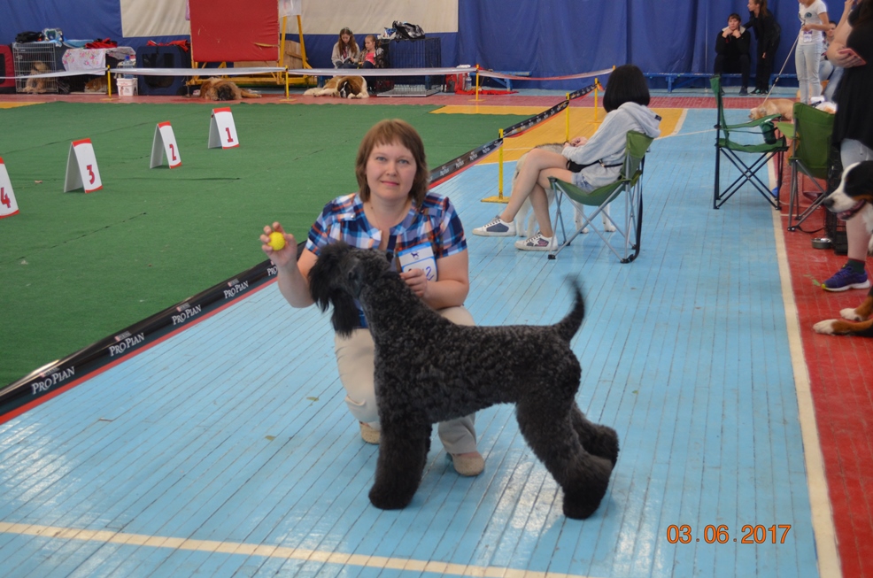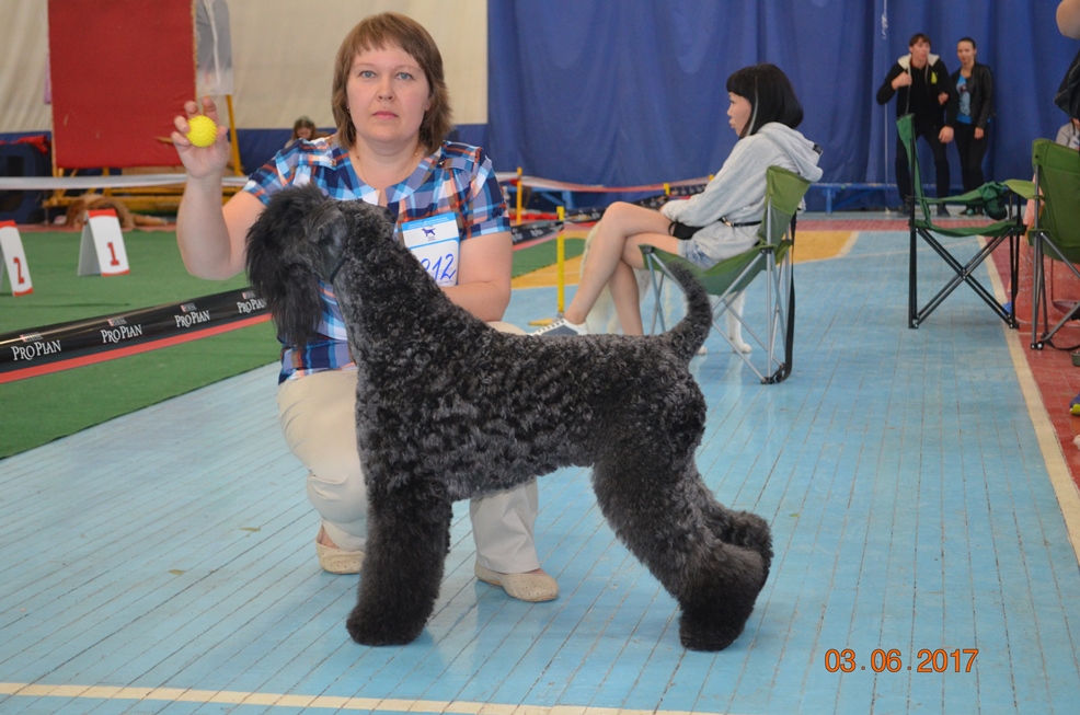 Результаты с САСИБА. Наконец получила фотографии от хозяйки. :) Наш блистательный, прекрасный, роскошный Блюз Талисман Корвин. Был представлен в единственном экземпляре. Но отработал на все 200 % ! :) ЛПП и Бест третьей группы! Мужественный и элегантный с точеной головой, прекрасно подготовленной шерстью и супер характером. А еще меня радуют владельцы! Первая собака у них, и так грамотно его показывают! Научились очень быстро и ставить в стойку и двигаться. Среди современных владельцев керри это такая редкость! Молодцы!! Итак БТ Корвин вл. и хэндлер Лещенко Елена, заводчик Герке Э. , и неизменный груминг Карпова Елена.