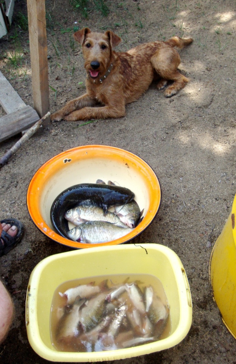 Вот так мы охраняем папин улов. На рыбалку с собой он ее не берет, потому что ловилась бы только она. В воде у нее вообще какие-то наклонности спасателя открываются - всех купающихся пытается выгнать на берег. Так и купаемся - один в воде, другой отвлекает Дону.