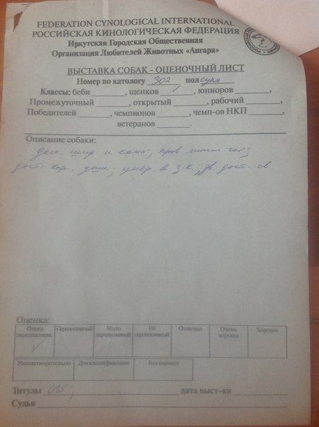 Оценка:отлично,Лучшая сука(конкуренции с Кешой),Лучший Юниор(в конкуренции с Тайсоном),Лучший Представитель породы(в конкуренции с Пусей),BIG 3(в жесткой конкуренции)