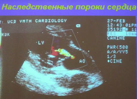 е) В категории «Сердечно-сосудистые заболевания» определена наследственная природа для 21 нарушения. Особое внимание уделяется обследованиям наследственных пороков строения сердца и коронарных сосудов. Например, недостаточность сердечных клапанов, стеноз устья легочной артерии, стеноз устья аорты. Эти нарушения не так заметны у новорожденных щенков, как более серьезные аномалии, и проявляются не раньше чем к возрасту 1 год. Они хорошо видны на эхо-кардиограммах (при ультра-звуковом обследовании, УЗИ).