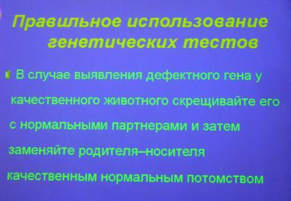 Далее Дж. Белл перешел к теме о генетических дефектах собак, о состоянии исследований по отработке ДНК-тестов для определения не только больных собак, но и носителей заболевания, внешне не проявляющих тревожных признаков.