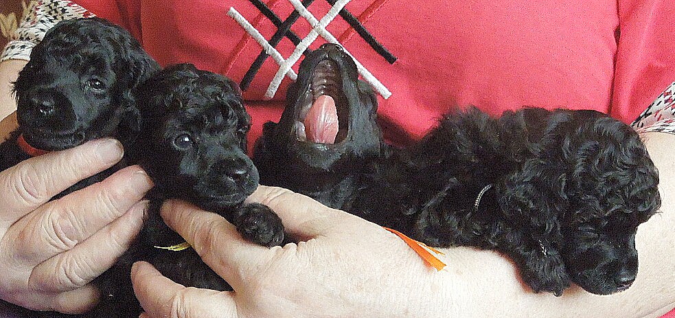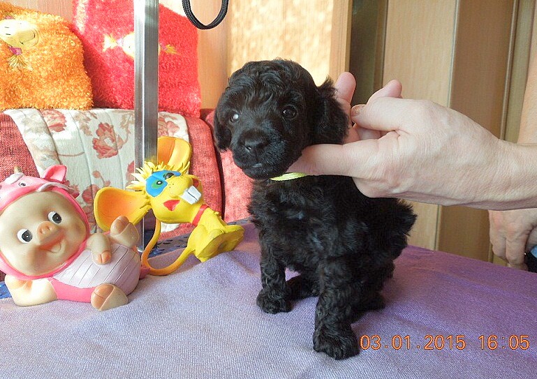 ...Свет Байкала Ориджин Дэнс(жёлтая лента,Ридж) родился достаточно крупным для той-пуделя(140г), но гены берут своё-сейчас в1,5мес он по весу самый мелкий-950г,хотя не худой и очень активный малыш.Ридж больше других любит общаться с людьми,первым из щенков начал вылезать из гнезда и играть с игрушками-с рычанием и лаем...Очень любопытен,любой новый предмет обнюхает первым.У Риджа самая длинная с шерсть,с очень густым подшерстком,красивая головка и длинная шейка...