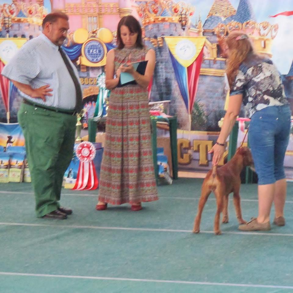 Спасибо организаторам выставки!!! Они умудрились пригласить всех именитых экспертов иностранцев. Призы стандартные без выпендрёжа. Обстановка и организация хорошая. Жара конечно здорово мешала – внутри как в сауне и на улице не ветерочка, по ощущениям 35 градусов. Даже трудно представить какого там было всем экспертам. Собаки мечтали где бы искупаться и мы все тоже. Я вообще по такой жаре без кондёра ещё туда и обратно по 800 км. Но все молодцы – выдержали!!! Для всех нас выставка была неожиданно и все по скорому готовились как могли ! И все мы, кроме Ольги, супер-пупер «выставляльщики»! Ага, и из всех нас троих я самый опытный. Но Грюттнер не стал фокусироваться на этом, где-то помогал и оценил именно собак. Сказал, что у всех нас очень породные , великолепные ИТ. Так, что пусть гордятся все заводчики – где какие крови сами знаете.