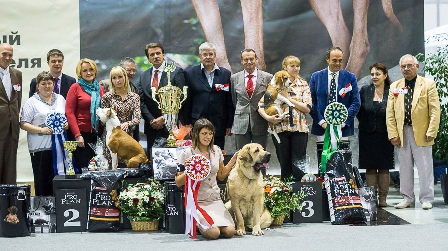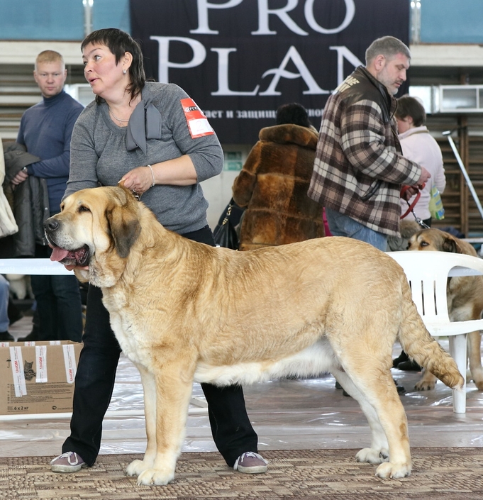 Я видела в интернете результат Вашей выставки и искренне ликовала. Молодцы! Такой успех, да ещё на интернациональной выставке. Больше всего приятно, что это собака уже российского разведения. Я дружу с некоторыми питомниками испанских мастифов и просматриваю информацию о линиях и представителях этой породы. Так хочу сказать, что мне очень нравится Versache, я просто в восторге от него, жаль, конечно, что с ним есть некоторые проблемы. Он очень красивый и деток много очень приличных от него. Масяня очень похожа на папу, красивая фотография.