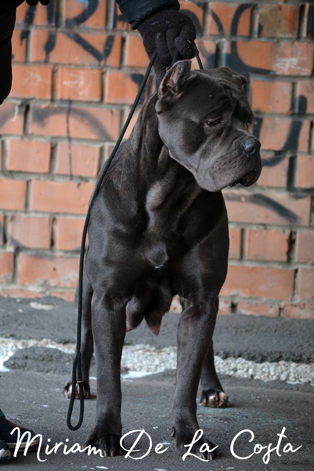 Мама - Мириам Де Ла Коста, красивая, породная сука с прекрасным характером, с хорошими охранными качествами, но без агрессии. Выставлялась в щенках (л/б, л/щ) и в юниорах. Имеет разводную оценку. Успешно сдан тест Т1 (пожизненный допуск в разведение). Проверена по потомству (непрепотентна, щенки получаются в отца). Двое щенков с этого помета уже успешно выставлялись и выставляются.